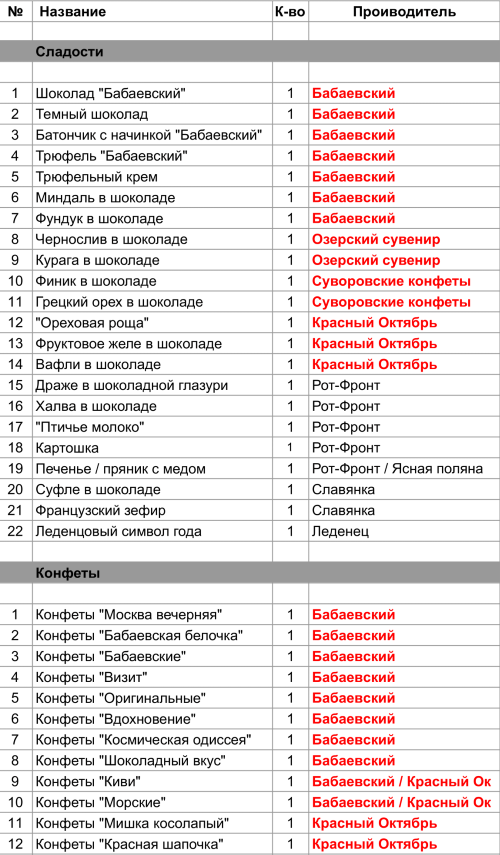 Шоколад "Бабаевский" (1 шт), Темный шоколад (1 шт), Батончик с начинкой "Бабаевский" (1 шт), Трюфель "Бабаевский" (1 шт), Трюфельный крем (1 шт), Миндаль в шоколаде (1 шт), Фундук в шоколаде (1 шт), Конфеты "Москва вечерняя" (1 шт), Конфеты "Бабаевская белочка" (1 шт), Конфеты "Бабаевские" (1 шт), Конфеты "Визит" (1 шт), Конфеты "Оригинальные" (1 шт), Конфеты "Вдохновение" (1 шт), Конфеты "Космическая одиссея" (1 шт), Конфеты "Шоколадный вкус" (1 шт), Конфеты "Киви" (1 шт), Конфеты "Морские" (1 шт)
